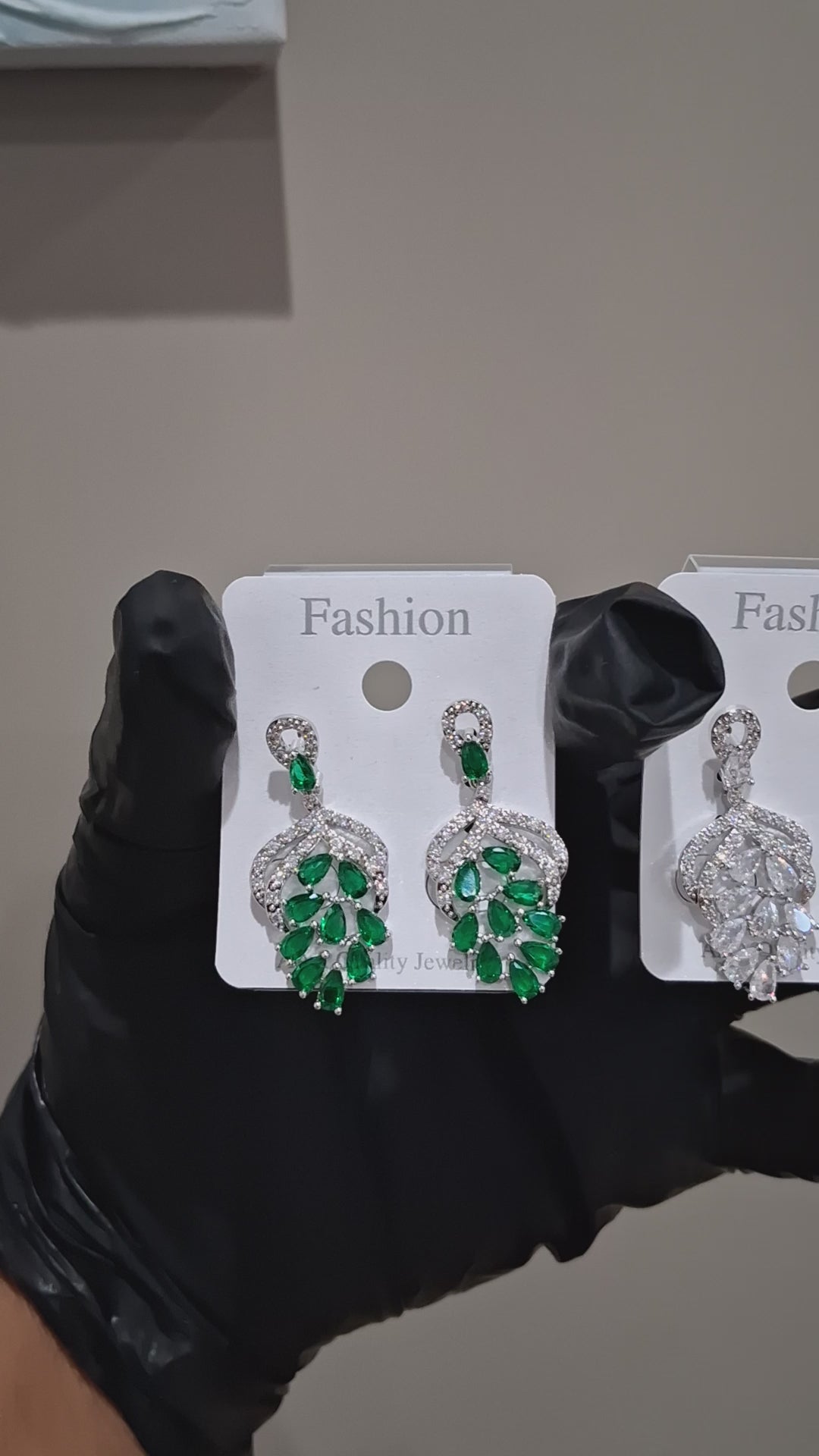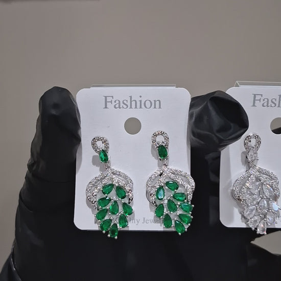 The image displays two pairs of long dangle drop earrings featuring a feather or spiked design, one with green stones and the other with white/clear stones.