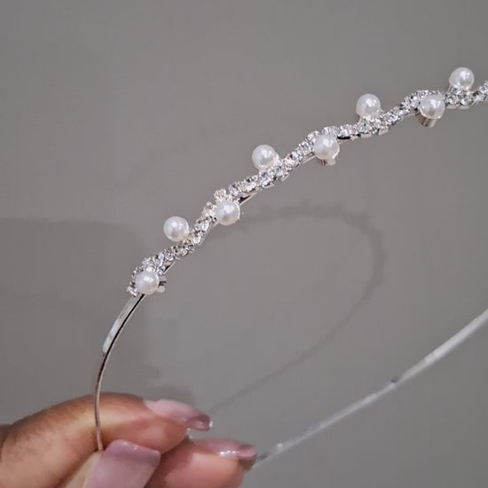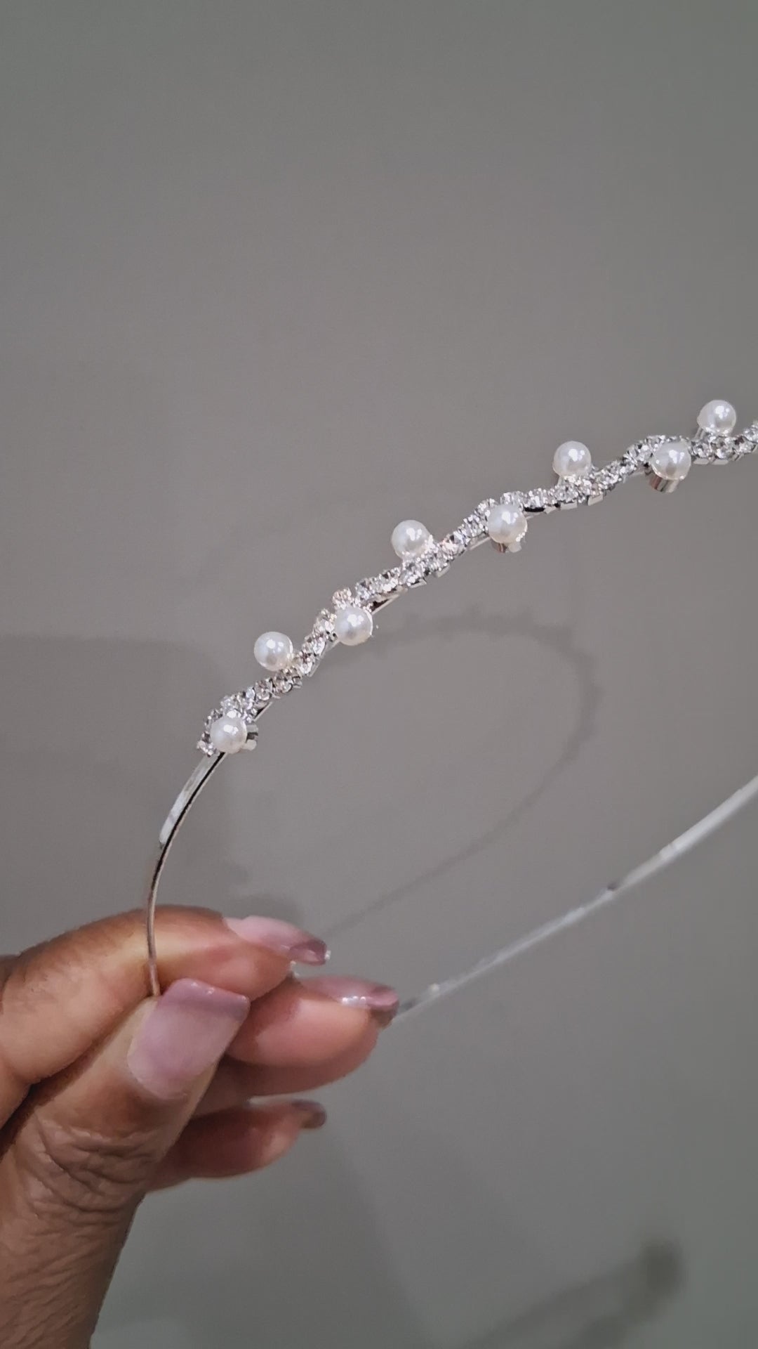 This is a single row sliver hair bandoo with a wavy design. This pearl and rhinestone headband, often sold as part of a set for weddings and parties.