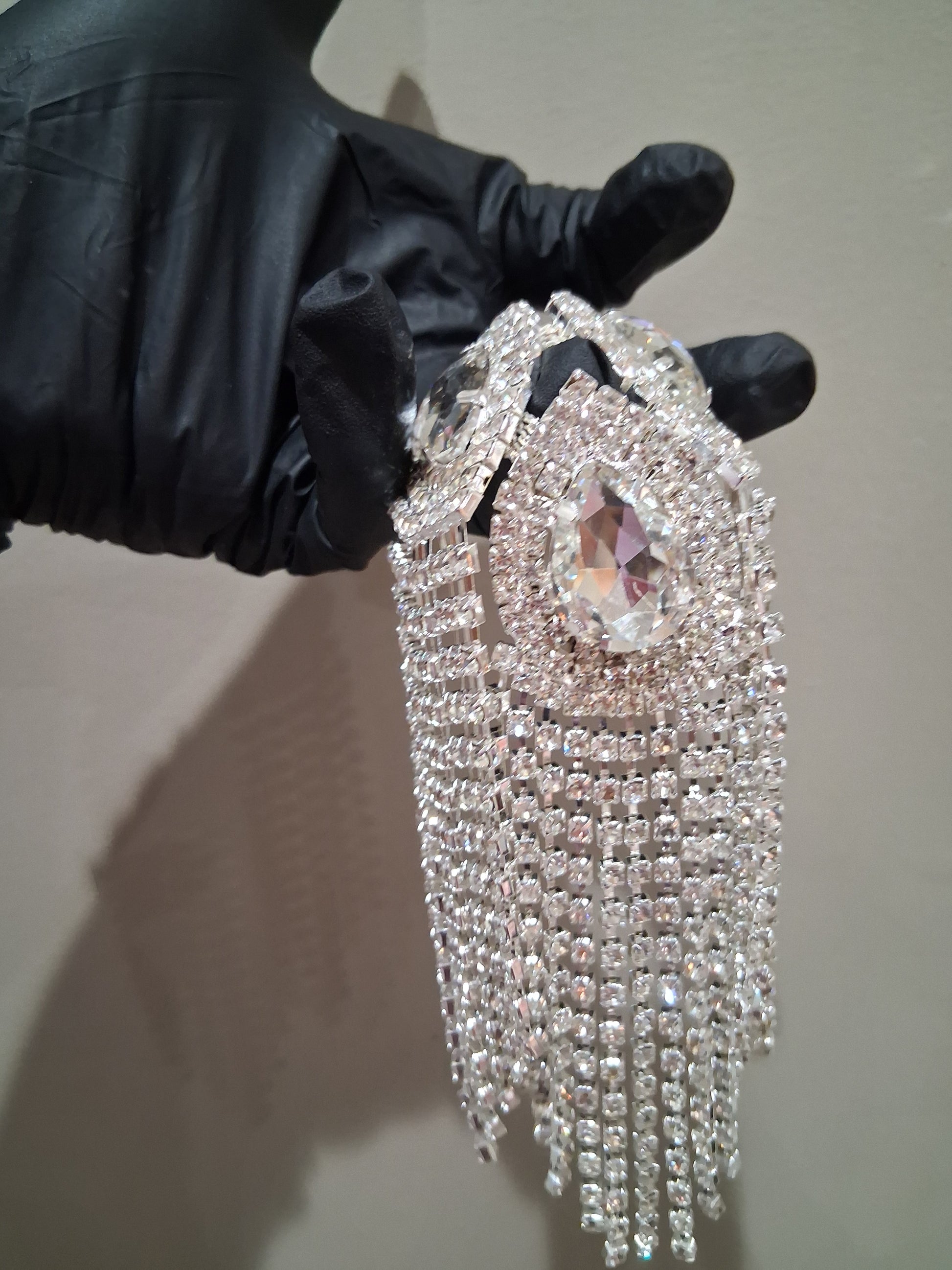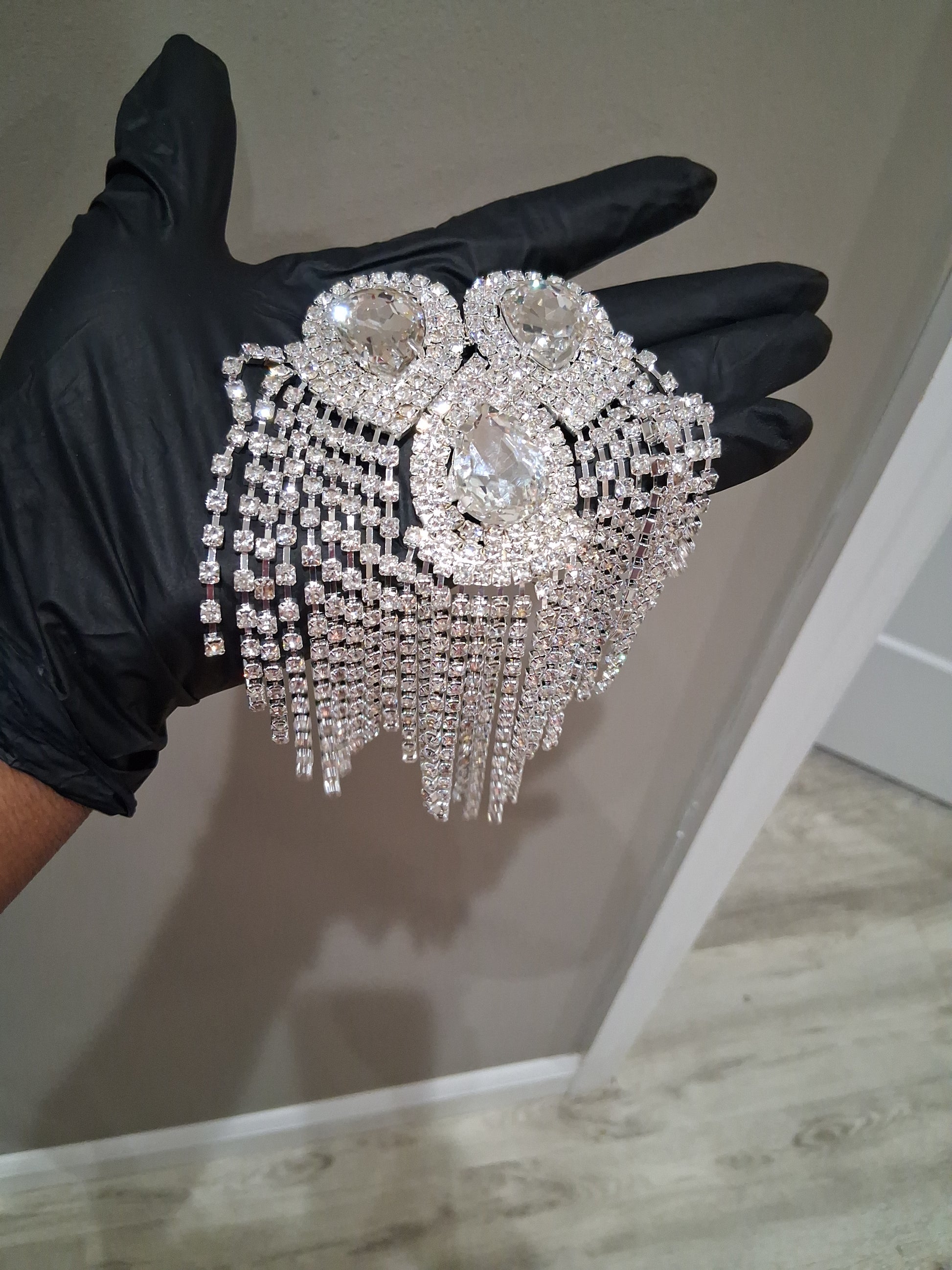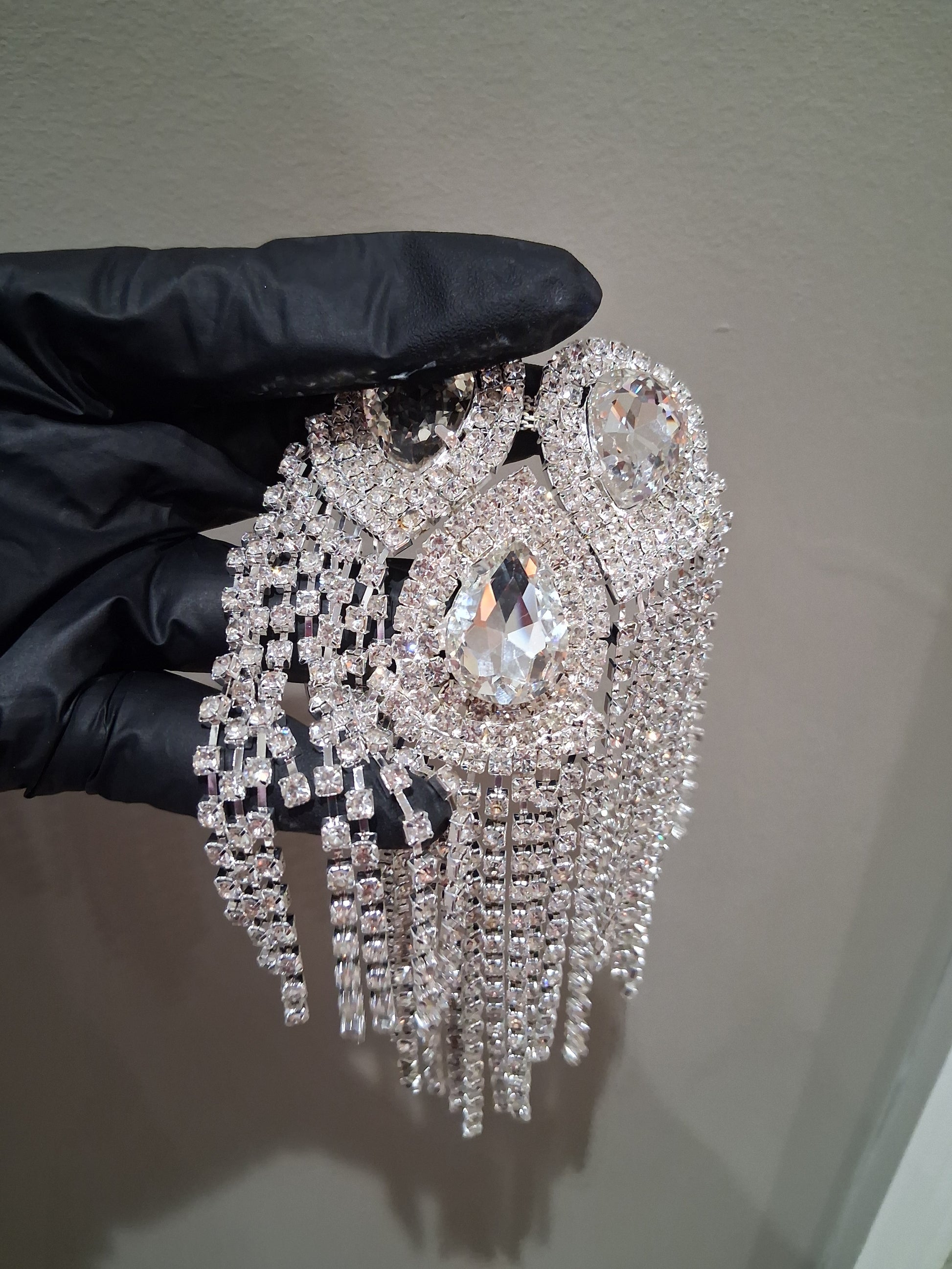 Material and Design: The epaulet is made with glitter rhinestones and features large central stones with multiple dangling chains or tassels.