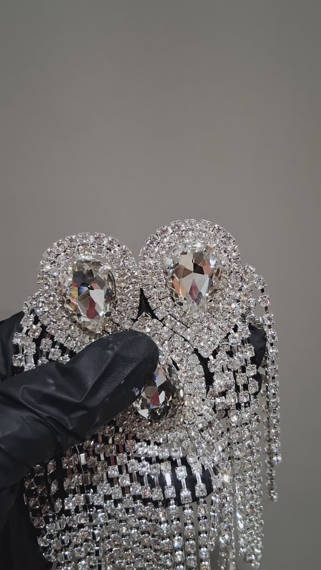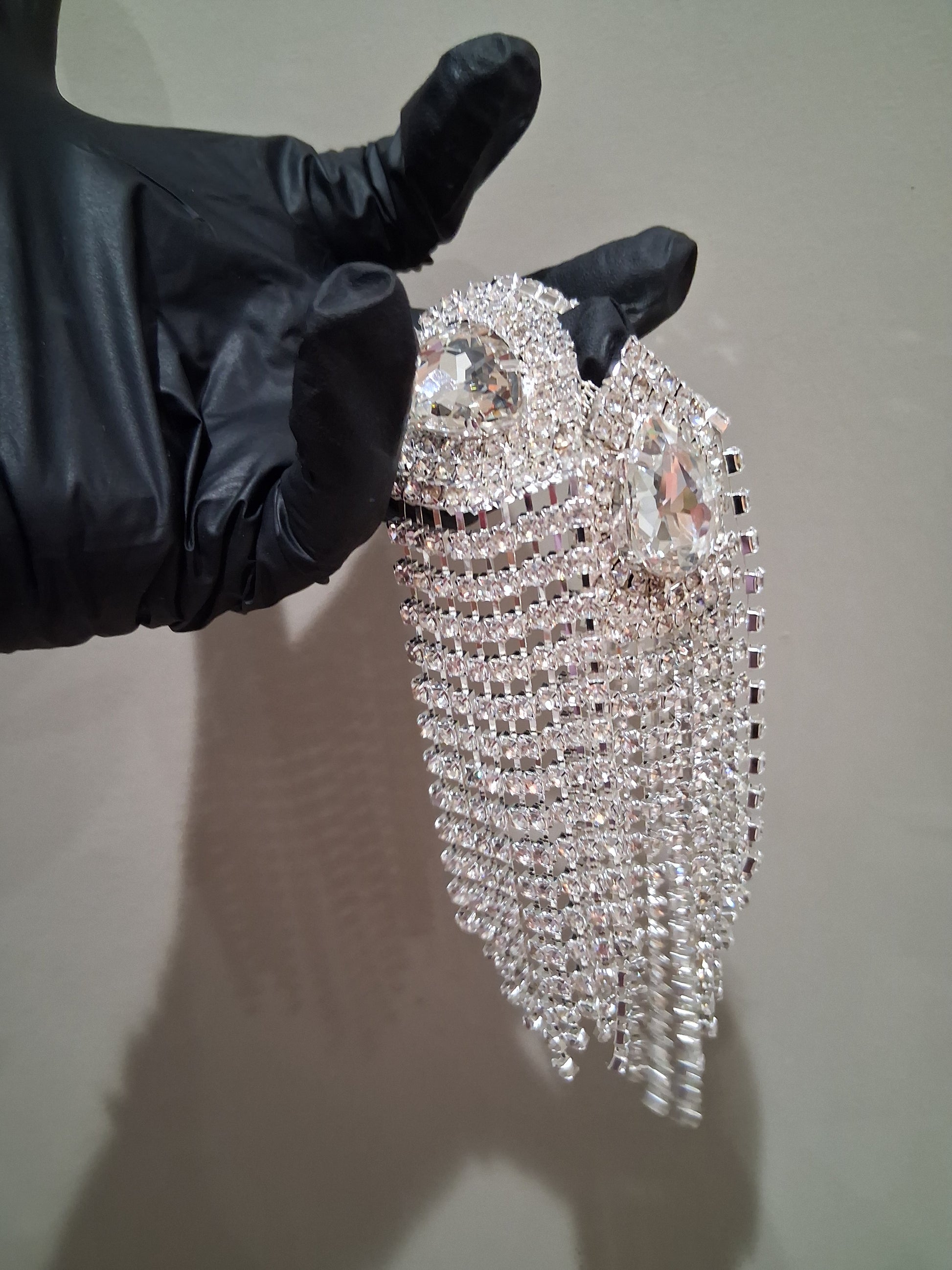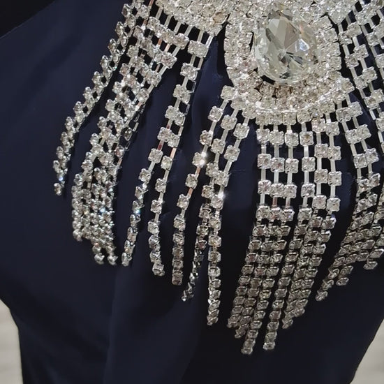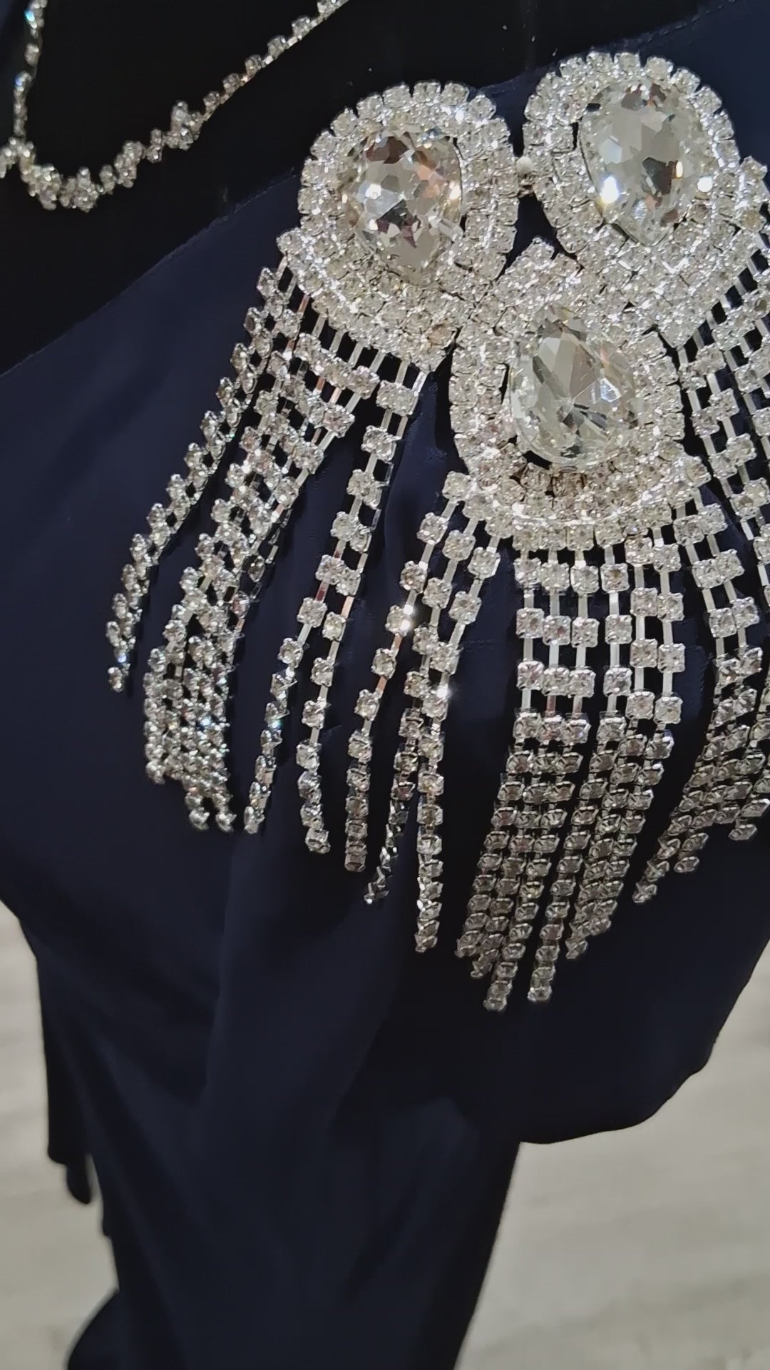 Material and Design: The epaulet is made with glitter rhinestones and features large central stones with multiple dangling chains or tassels.