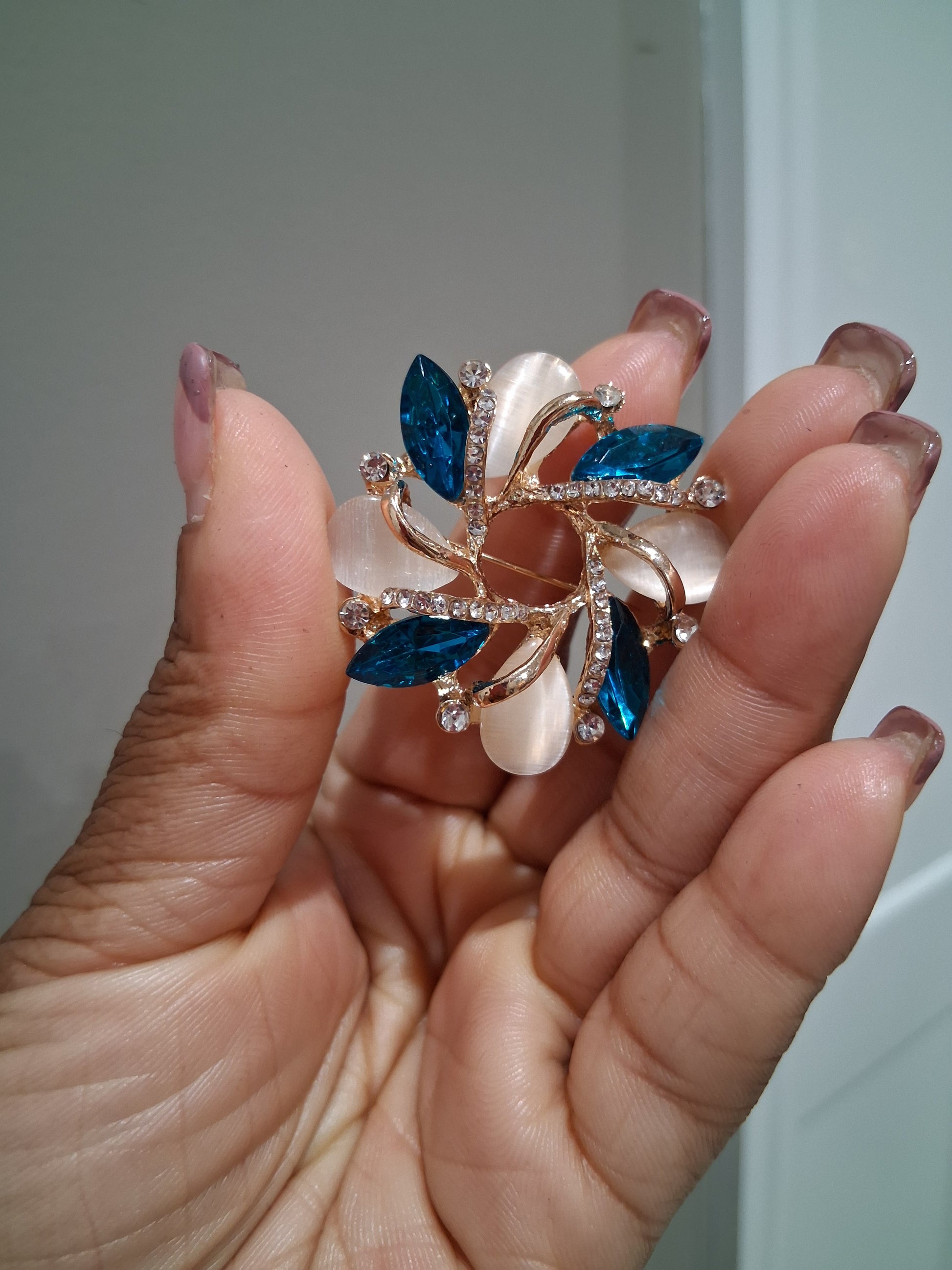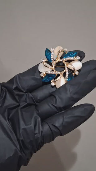 The brooch features a floral design with petals made of a light-colored, possibly opalescent, material and leaves or accents crafted from dark blue, marquise-shaped crystals.